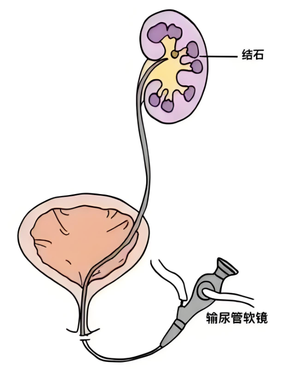 经尿道输尿管软镜下钬激光碎石术是治疗肾结石及输尿管上段结石的一项微创技术。 是利用一条直径3mm左右的高清电子输尿管软镜,经过尿道、膀胱插入输尿管到达肾盂、肾盏内,利用钬激光光纤将输尿管上段结石及肾结石击碎后取出和引流排出。 它利用人体天然的泌尿系统腔道,不在身体上做任何切口,是一种纯粹的泌尿外科腔镜微创手术。